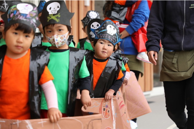11/25(水)に年少児は海賊に扮して園内を冒険し、各グループに分かれて色々なミッションにこどもたちが協力しながら挑戦し、金貨を集めるという内容でした。