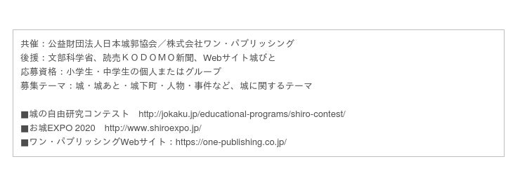 株式会社 ワン・パブリッシング(東京都台東区/代表取締役社長:廣瀬有二)と公益財団法人日本城郭協会が共催する「小学生・中学生 城の自由研究コンテスト」は、今年で19回を迎えた「城」をテーマにした自由研究のコンテストです。個人でも団体でも応募できるので、夏休みの自由研究としても人気です。この度、応募総数272作品より選ばれた第19回の入賞作品を発表しましたので、お知らせします。