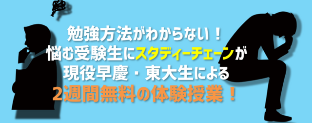 そんな高校生のために、オンライン学習塾スタディーチェーンが、現役早慶・東京大学に合格した学生が、「正しい勉強方法」を無料で2週間指導します!