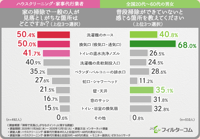 そこで今回、給気口・吸気口・24時間換気口フィルター専門店「フィルターコム」(https://www.filcom.jp/)を運営している日本住材株式会社は、ハウスクリーニング・家事代行業者と全国20代~60代の男女を対象に、「掃除で見落としがちなポイント」に関する調査を実施しました。