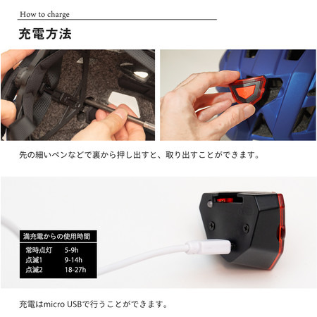 後頭部に搭載された充電式のLEDライトは、約300m以上離れた場所からも視認が可能でドライバーへの注意喚起を促進するライトになっています。また競技用・大人用ヘルメットと同様のインモールド製法で作られているため総重量も約240gと軽量になっており、通学時にもストレスフリーになるよう設計されています。