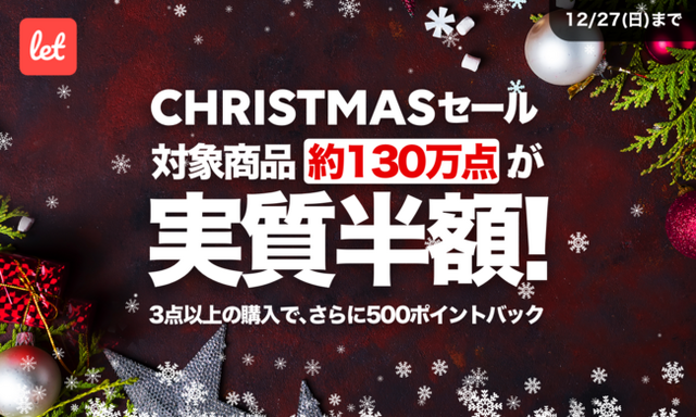 株式会社レット(本社:東京都港区、代表:佐藤 航陽)は、自社で運営する訳あり品のマーケット「Let(レット)」内で「CHRISTMAS SALE」を12月24日(木) 正午より開催いたします。期間中に対象商品をご購入いただくと、購入金額の50%をポイント還元いたします。更に商品を複数購入すると追加でポイントをプレゼントいたします。期間中のご購入であれば、ポイント還元はお一人様あたり何度でもご利用いただけます。