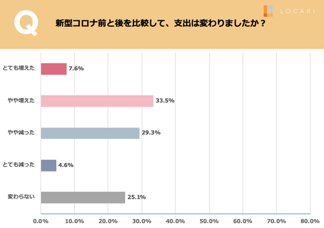 新型コロナ前と後を比較して支出は変わったか尋ねたところ、「とても増えた」と「やや増えた」が合わせて41.1%、「やや減った」と「とても減った」が合わせて33.9%という結果になりました(n=263)
