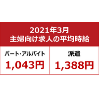 【主婦求人の平均時給 2021年3月】パート・アルバイト:『1,043円』、派遣:『1,388円』