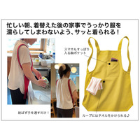 サッと両腕を通すだけで使えて、ヘアスタイルが崩れないのもうれしい!時短エプロンならお出かけ前のバタ…