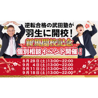 埼玉県羽生市に学習塾『武田塾羽生校』が開校!8月28日~4週連続で個別相談イベント「地上最速の勉強方法 個別に教えちゃいますスペシャル」の開催が決定致しました。大学受験予備校 日本初!授業をしない。武田塾