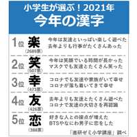 <「進研ゼミ小学講座」 小学生1.6万人の意識調査ランキング2021> 小学生が選ぶ「今年の漢字」トップ3は「楽」「笑」「幸」