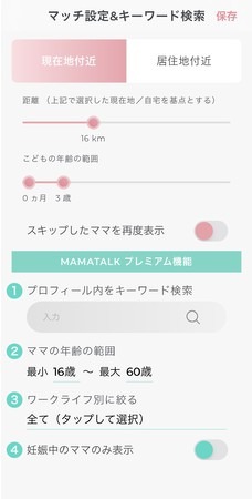 アプリサービスを最初にリリースしてから1年以上が経ち、ユーザーの皆様の声に耳を傾ける中で「もっと詳細なマッチ設定でフィルターをかけて、より自分と気の合うママと出会いたい」という乳幼児ママたちのニーズが分かりました。また昨年の新型コロナウイルスの流行で、実際に会えない距離にいても全国のママの中から共通点のあるママ同士で繋がって情報交換や悩みを共有したい、という声も多く頂戴しました。そこで、キーワード検索をはじめ、豊富なマッチ設定機能を「MAMATALKプレミアム」サービスとして準備いたしました。