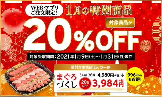 コロワイドグループのかっぱ寿司(カッパ・クリエイト(株) 本社:神奈川県横浜市 代表取締役社長 小澤俊治)は、2021年1月9日(土)~1月31日(日)の受取期間、WEBおよびアプリからのご注文限定で対象のお持ち帰りメニューの20%OFFキャンペーンを開催いたします。