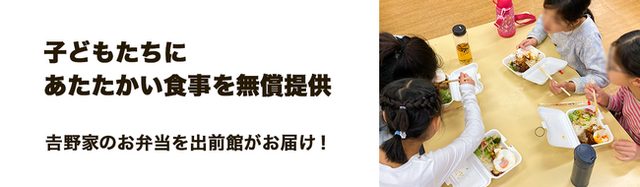 今回は、その取り組みを進化させ、子ども食堂事業を行う「JEO」と「うまい・やすい・はやい」がコンセプトの有名牛丼チェーン店「吉野家」、『出前館』が共同で実施し、家族での食事機会のない子どもたちなど、学童等の施設で食事をとる子どもたちに、出来立てのあたたかい食事を食べてもらう機会を設け、子どもたちを支援する方々の負担を軽減することを目的として、2021年3月から吉野家のお弁当を無償提供する取り組みをスタートいたします。
