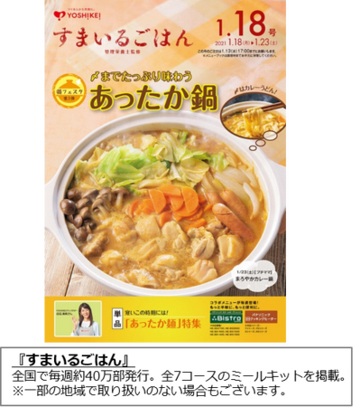 つくる人から笑顔に。をテーマに全国で“食材(ミールキット)宅配サービス”を提供するヨシケイグループの本部、ヨシケイ開発株式会社(本社:静岡市 代表:井野口 雄一)は、全国で毎週40万部発行するメニューブック『すまいるごはん』の 1/18号にて今シーズン第3弾となるヨシケイの鍋フェスタ、「〆までたっぷり味わう あったか鍋」を特集します。