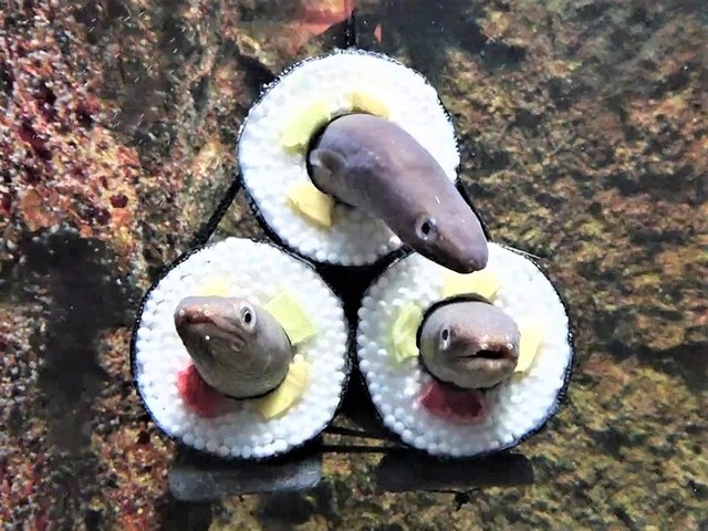 昨年、アナゴの隙間に隠れる習性を活かし、水槽内に恵方巻型の筒を設置した「アナゴの恵方巻水槽」の展示を行い、公式Twitterでの投稿が1.5万リツイート、2.8万いいねと大きな反響がありました。その反響を受け、今年は、恵方巻をひとまわり大きく改良し、恵方巻から複数のアナゴたちが顔をのぞかせる姿をご覧いただけます。「アナゴの恵方巻水槽」を見ながら無言で願い事をすれば叶うかも!?