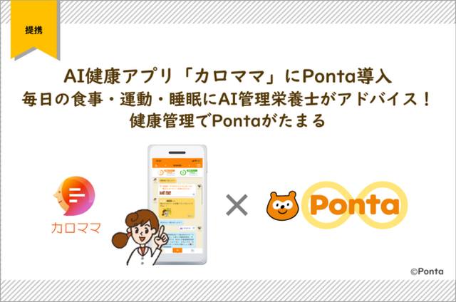AI健康アプリ「カロママ」に「Ponta会員ID」を登録し、「カロママ」に毎日ログインするたびに貯まるスタンプを20個集めると、1Pontaポイントがたまります。「カロママ」で毎日の食事や運動などのアドバイスを受けながら、Pontaポイントがたまるサービスで、楽しく健康管理を続けていただけます。