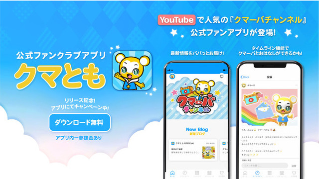 ファンクラブアプリ「クマとも」では、「クマーバチャンネル」の最新情報はもちろん、クマーバと交流できるタイムラインや、運営スタッフによるブログ、動画配信やイベントなどのスケジュール機能など盛りだくさんの内容になっています。