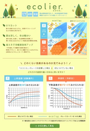 生地のベースは帝人フロンティアが開発した『エコリエ』という特殊カーテン素材を使用。夏はUVカット81.4%遮熱23.2%で涼しく、冬は保温効果で快適に過ごすことが出来ます。冷暖房の効率も上がるため省エネに貢献してくれる優れもの。