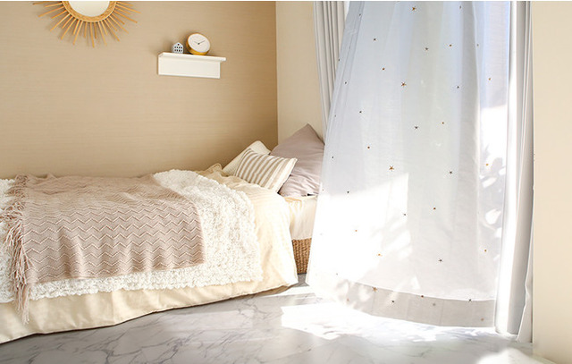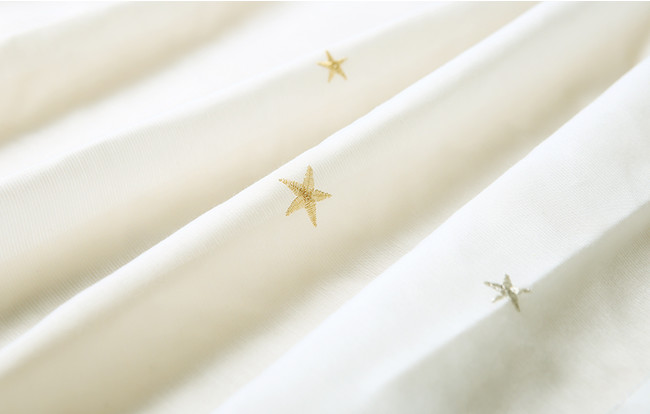 「エトワール」とはフランス語で星のこと。ゴールドとシルバーの刺繍がさりげなく輝き、風に揺れるとまさに星がまたたいているかのよう。大きい星と小さい星がランダムに散りばめられ、お部屋をドリーミーに彩るレースカーテンです。