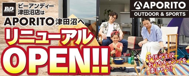 『APORITO』(アポリト)は自社で立ち上げたオリジナルブランドの名を看板に掲げ、従来のスポーツショップに大人はもちろん、お子様も楽しめるアウトドア・レジャー用品を取り入れ『子供が主役!おうちキャンプを楽しもう!!』をテーマに、スポーツ・アウトドア・リカバリー・ヘルスケアが融合したNEWストアです。