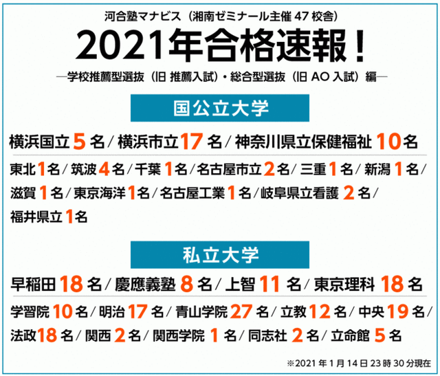「河合塾マナビス」湘南ゼミナール主催47 校舎では、一般入試を見据えた学習により基礎学力を高めていくことで、総合型選抜(AO)・学校推薦型選抜においても高い合格実績へとつながっています。