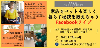 株式会社Homeport(本社:福岡市)の代表 西崎彩智は、2021年1月27日(水)の21時からFacebookにて無料のトークライブを実施します。昨年12月に動画配信した「家族もペットも楽しく暮らす秘訣」をテーマに、仙台市の森のいぬねこ病院グループ院長である西原克明先生をゲストに迎え、ペットと家族の幸せについて熱く語ります。