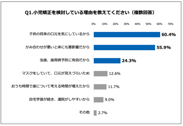 「Q1.小児矯正を検討している理由を教えてください(複数回答)」(n=111)と質問したところ、「子供の将来の口元を気にしているから」が60.4%、「かみ合わせが悪いと体にも悪影響だから」が55.9%、「虫歯、歯周病予防に有効だから」が24.3%という回答となりました。