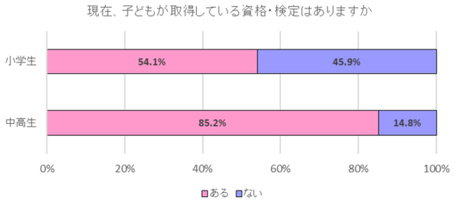 保護者に、子どもが現在取得している資格・検定があるかを聞いたところ、小学生保護者の54.1%、中高生保護者の85.2%が「ある」と回答した。