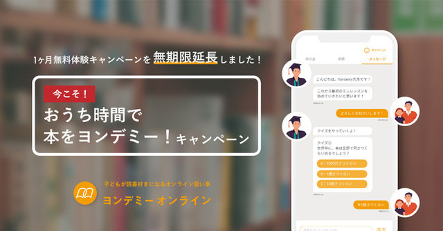 こうした背景から、『ヨンデミーオンライン』では、行動が限られる中でのおうち時間にて、子どもたちが「読書」を通して多様な経験と学びを得られる機会を提供するべく、『ヨンデミーオンライン』の一ヶ月間無料体験キャンペーンを無期限延長いたします。