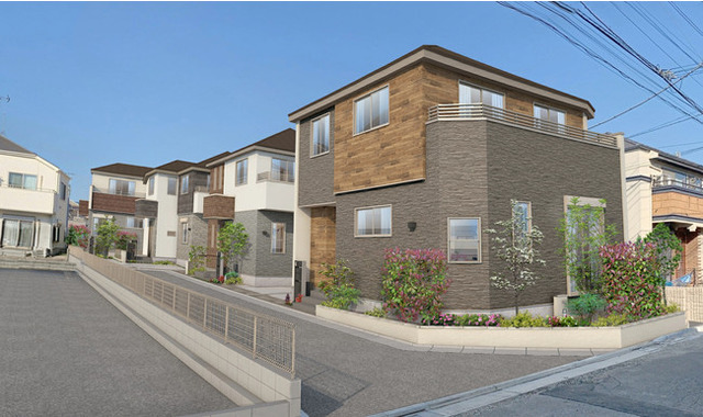 当分譲地は開放的な角地地区に位置し、リビングの天井高を2.7Mに設定することで豊かな陽光を取り込めるようにしました。街区内道路は、他の車の通り抜けがないため、安心・安全なコミュニティスペースにもなります。建物の外観は、石積調と木目調のサイディングをアクセントに、周囲に調和するナチュラルな住まいを創出し、都内でもゆとりの暮らしが実現する2階建てプランです。