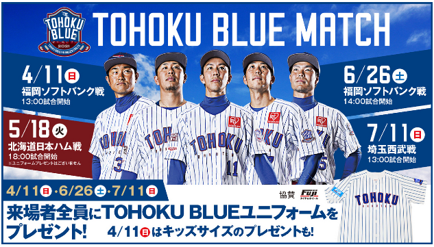 株式会社楽天野球団(本社:宮城県仙台市宮城野区、代表取締役社長:立花 陽三)は、2021シーズンも選手がスペシャルユニフォームを着用して闘う「TOHOKU BLUE MATCH」と「FANS' MATCH」を開催することとなりましたので、お知らせいたします。