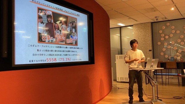 およそ75%、過去には1日で555名もの子どもたちが仮想都市の中で、自分が手作りした商品やサービスで出店・起業をしています。