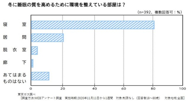 「冬に睡眠の質を高めるために環境を整えている部屋」についてアンケート調査したところ、寝室と回答した人が82%と最も多く、居間は21%、脱衣室や廊下は5%未満と低い結果となりました。