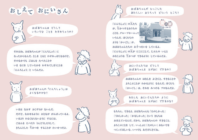 主人公の女の子が大好きなおばあちゃんとの関わりの中で、認知症のこと、グループホームでの暮らし、介護士の存在を知り、その重要性を理解していきます。主人公の女の子と一緒に、読者である子どもたち、保護者の方々が認知症介護の様子や大切さを知ることができる内容になっています。