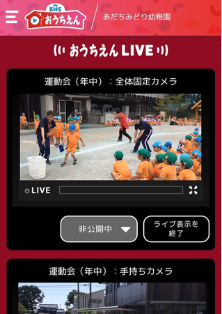 ライブ配信は、園にあるスマホやタブレットに専用アプリをインストールして、撮影を行います。保護者と園児はおうちえんにログインするだけで、臨場感のある生中継の動画を鑑賞できます。