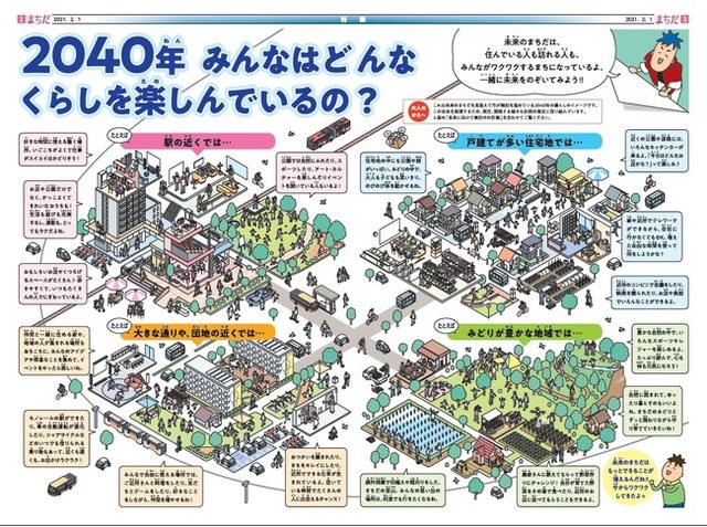 アイデア募集は、広報まちだ2021年2月1日号特集「みんなで描くまちだの未来」で実施しています。紙面ではこの他にも、2040年の暮らしのイメージや未来を考える漫画なども掲載し、子どもたちにもわかりやすい紙面となっています。子どもをメインターゲットとした広報紙を発行するのは初めての試みです。