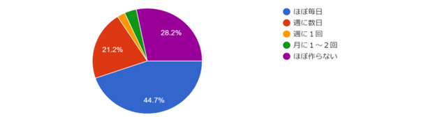 お弁当を「ほぼ毎日作る」と回答した人が約5割。「週に数日」派とあわせると7割程度の主婦にとって、お弁当作りが朝のルーティーンとなっています。