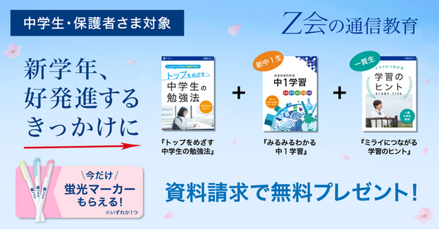 株式会社増進会ホールディングス(Z会グループ)のグループ会社である株式会社Z会は、「Z会の通信教育」中学生向けコースにおいて、新中1生~新中3生を対象にした「春のロケットスタートキャンペーン」を実施しています。中学入学・進級を控えたお子さまが、新学年を好発進するのに役立つ冊子に加えて、勉強するときに目に優しく重要ポイントをマークしやすい蛍光ペンを1本無料プレゼントします。Z会中学生向けコースの資料と一緒にお届けしますので、ぜひこの機会にZ会中学生向けコースの資料を請求してみませんか?