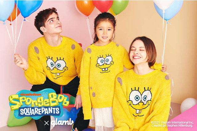 スポンジ・ボブとglambによるコラボレーションは大人から子どもまで着用できる全12型をラインナップ。スポンジ・ボブやその親友パトリックを大胆に落とし込んだプルオーバーニット、作品に登場するモチーフの数々を総柄であしらったパジャマセットアップ、キャラクターたちの住むビキニタウンを足元に表現したスニーカーなど、glambらしいデザインワークで『スポンジ・ボブ』を表現しました。