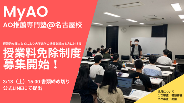 特にAO推薦入試(総合型選抜)の場合は独自で情報収拾をし、また書類作成など準備をすることは難しい場合も多くあります。そこで、僅かならがではありますが、2021年度は2名に限り入塾料金を含め、最初から最後まで完全に無料での指導を行います。