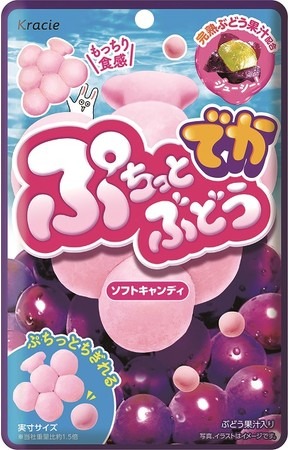 「ぷちっとでかぶどう」は、「ぷちっと」シリーズの人気商品「ぷちっとぶどう」の一粒のサイズを大きくし、食べ応えがアップしました。もっちりとした食感と、完熟ぶどう果汁配合でジューシーな味わいを楽しめます。