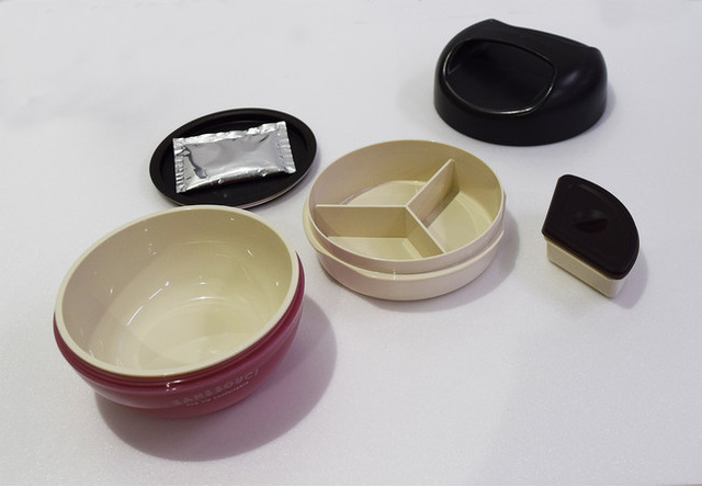 カーリングのストーンのような形が特徴的でのっけ弁、麺弁当に使いやすいと好評などんぶり型ランチボックスが抗菌仕様になりました。内容器、中段、仕切り、たれ容器と食材を入れる部分に抗菌剤バクテキラーが樹脂に練り込まれています。保冷剤もついていて夏場のお弁当の定番に安心をプラス!