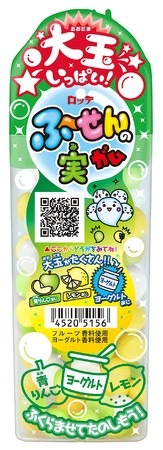 出たらラッキーな「大玉」がいっぱい入った!大玉好きにはたまらないふ~せんガムです。味は小玉の青りんご味とレモン味、大玉のヨーグルト味の3種類。いろいろな味が楽しめます。また、パッケージのQRコードから、人気のユーチューバーのふ~せん動画やふ~せんガムのふくらませ方を紹介するページを見ることができます。見て楽しい、食べて美味しいふ~せんの実! 大きくふくらませて、君もふ~せんガム名人になろう!!