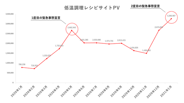 低温調理器「BONIQ」による低温調理レシピサイトは、2017年5月から開始し、2019年10月には月間50万PVを達成、新型コロナウイルスの影響が出始めた2020年3月から急激に伸び始め、一度目の緊急事態宣言時には月間266万PVを突破しました。緊急事態宣言が明けた6月以降は緩やかに推移したものの同年12月のGoToトラベルの中止、年明け1月の二度目となる緊急事態宣言発令により再び上昇し、過去最高となる月間326万PVを記録するほどに成長しています。一度目、二度目と緊急事態宣言による外出規制、自粛期間中にアクセスがピークになる傾向に対して「10都府県で3月7日まで自粛が延長されました。夜20時以降は外出できないため、せめて自宅の料理は外出気分を味わいたいと考え、低温調理にたどり着いた方が増えた結果と言えます。低温調理の良さは、高級料理店のような味や見た目を再現できる点。また免疫力アップに効果があるとされる、たんぱく質等の旨味をしっかり閉じ込めるのも魅力のひとつです。私たちは、自宅で手軽に美味しい料理が楽しめるよう、これからも低温調理レシピコンテンツの充実を図ってまいります」(葉山社中、羽田和広)。