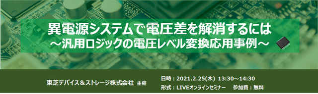 東芝デバイス&ストレージ株式会社(本社:東京都港区、代表取締役社長:佐藤 裕之)は、来る2月25日(木)に、「異電源システムで電圧差を解消するには ~汎用ロジックの電圧レベル変換応用事例~」と題し、無料Webセミナー(ウェビナー)を開催いたします。電子機器の開発や設計に携わっている方で、特にシステム機器内の電圧のレベル変換に課題をお持ちの方、汎用ロジックIC(レベルシフター、2電源バススイッチ)の技術動向について知りたい方にお薦めです。