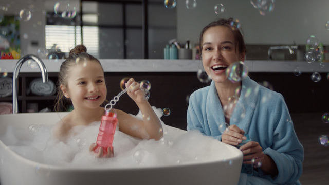 今回の「リンスイン」篇は、ママと子どもがバスタイムにシャボン玉を楽しむ姿を描いています。母娘の豊かな表情とスローテンポの「プリティ・ウーマン」の楽曲で、2人のバスタイムにゆったりとした時間が流れます。