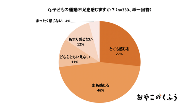 子どもの「おうち時間」の過ごし方について、「子どもの運動不足を感じるか」を聞いたところ、「とても感じる」27%、「まあ感じる」46%を合わせ、全体の73%が「子どもの運動不足を感じる」と回答しました。就学前の幼児期は、体を使って様々な動きができることに「おもしろさ」を感じたり、体の発達の基礎作りとなる大切な時期といわれ、コロナ禍で子どもの運動機会が減っていることに不安を感じている家庭が多い様子がうかがえます。