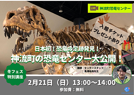 神流町恐竜センター(群馬県多野郡神流町)とキッズシーズ株式会社(東京都中央区)は、2021年2月21日(日)13:00~14:00、全国の子どもたちに向けて、無料のオンライン授業「日本初の恐竜の足跡発見!神流町の恐竜センター大公開!」を共同で開催します。