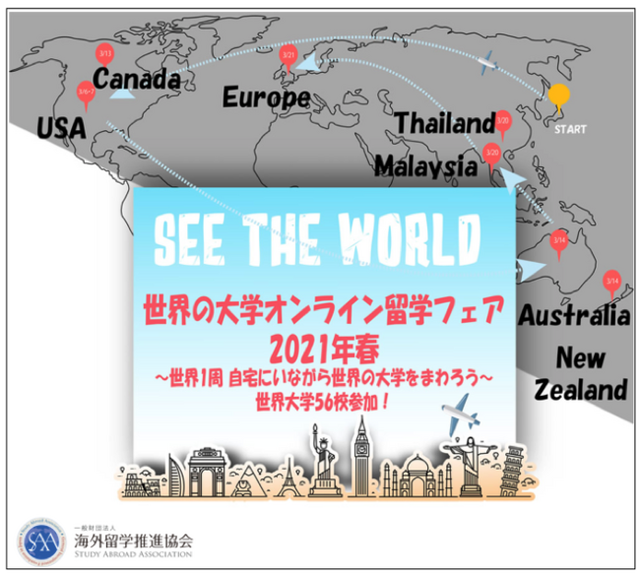 2020年大好評でしたオンラインの大学フェアに続き、2021年春(2月27日~3月27日まで)の日程で「世界1周 世界の大学留学フェア」の開催が決定いたしました。海外への大学進学を検討する学生の皆様にとってはとても貴重な情報収集の場となります。(実際に大学の担当者からお話を聞くことができます。)このコロナ禍の中、世界中の学校担当者が日本にいる学生の皆さんのためにZoomを使ってより詳しく学校情報をお話ししてくださいます。是非この機会に本留学フェアをご活用ください。