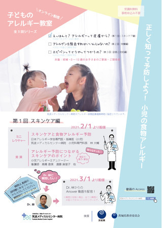このたび筑波メディカルセンター病院では、茨城県および茨城県教育委員会に後援頂き、子どものアレルギー教室を動画配信する企画をスタートしました。アレルギー疾患医療連携病院として、県内外を問わず広く、小児アレルギーにお悩みの保護者、学校保健に関わる皆様のお役に立てる知識と体験をご提供できればと考えております。期間限定(2/1~2/14)で質問も受け付け、お答えする動画(3/1~)も配信します。