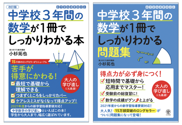 その著者・小杉 拓也先生による“中学3年間”バージョンである、『改訂版 中学校3年間の数学が1冊でしっかりわかる本』と、待望の『中学校3年間の数学が1冊でしっかりわかる問題集』が新たに登場しました。