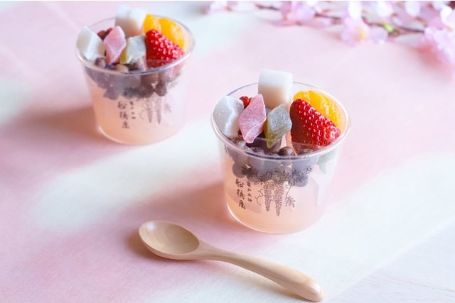 内容:桃寒天、桃シロップ、小豆餡、三色求肥、苺、みかん、クコの実、赤えんどう豆、くず餅