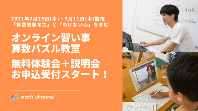 株式会社math channel(代表取締役社長 横山 明日希・東京都渋谷区)はzoomを利用したオンライン習い事、小学校低・中学年向け「オンライン算数パズル教室」の<無料体験会+説明会>イベントのお申込み受付をスタート致しました。開催日時は、2021年2月25日(木)及び3月11日(木)、各日16時30分~(新1年生向け)、18時~(新2年生~4年生向け)となります。